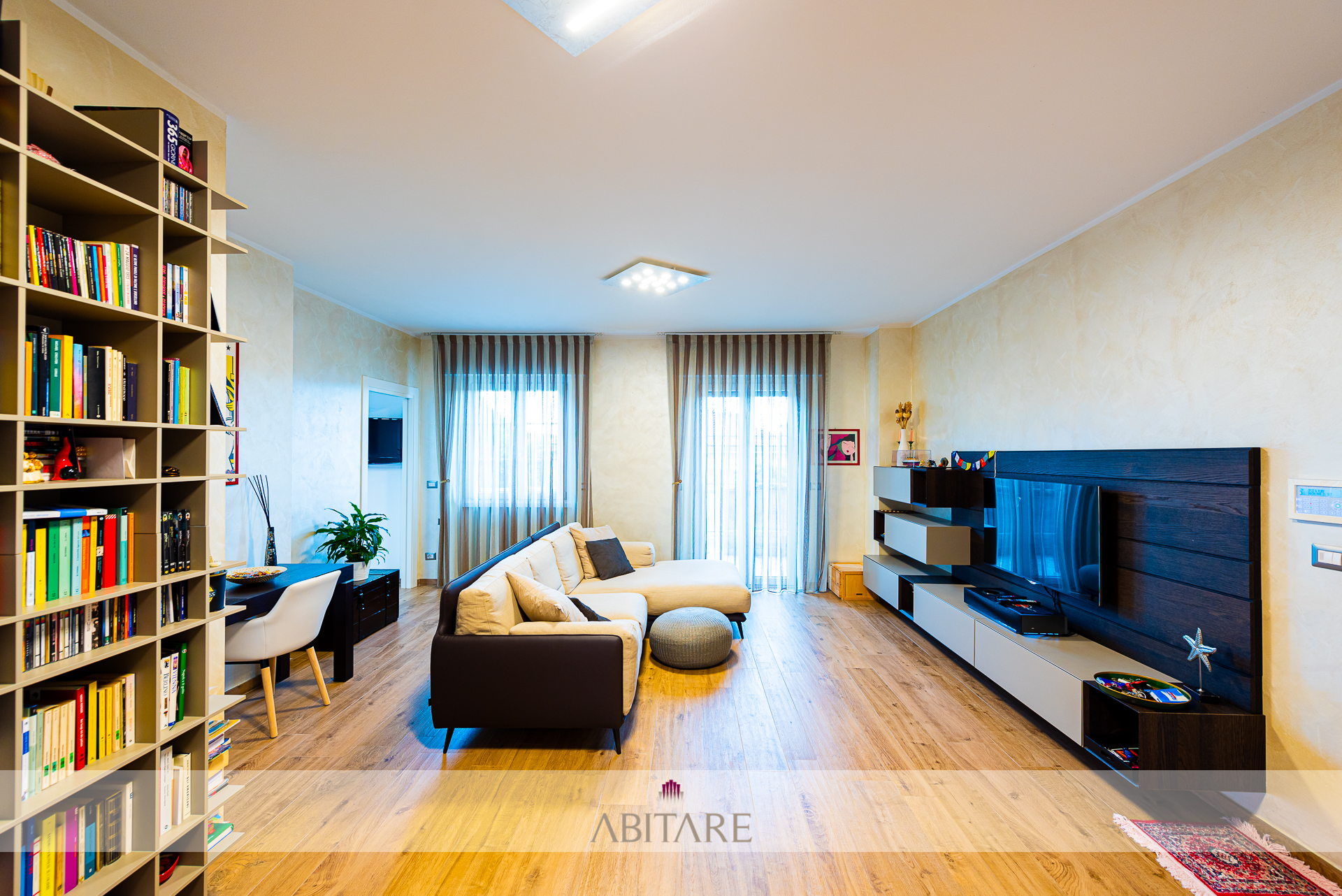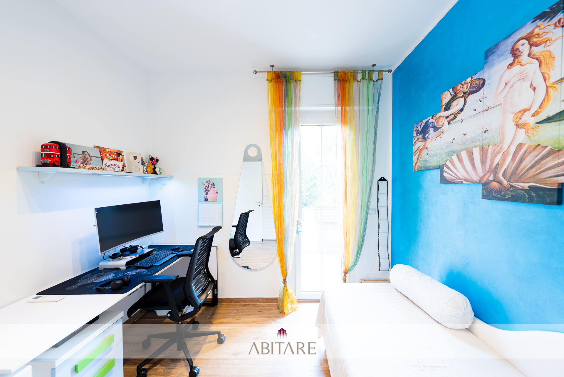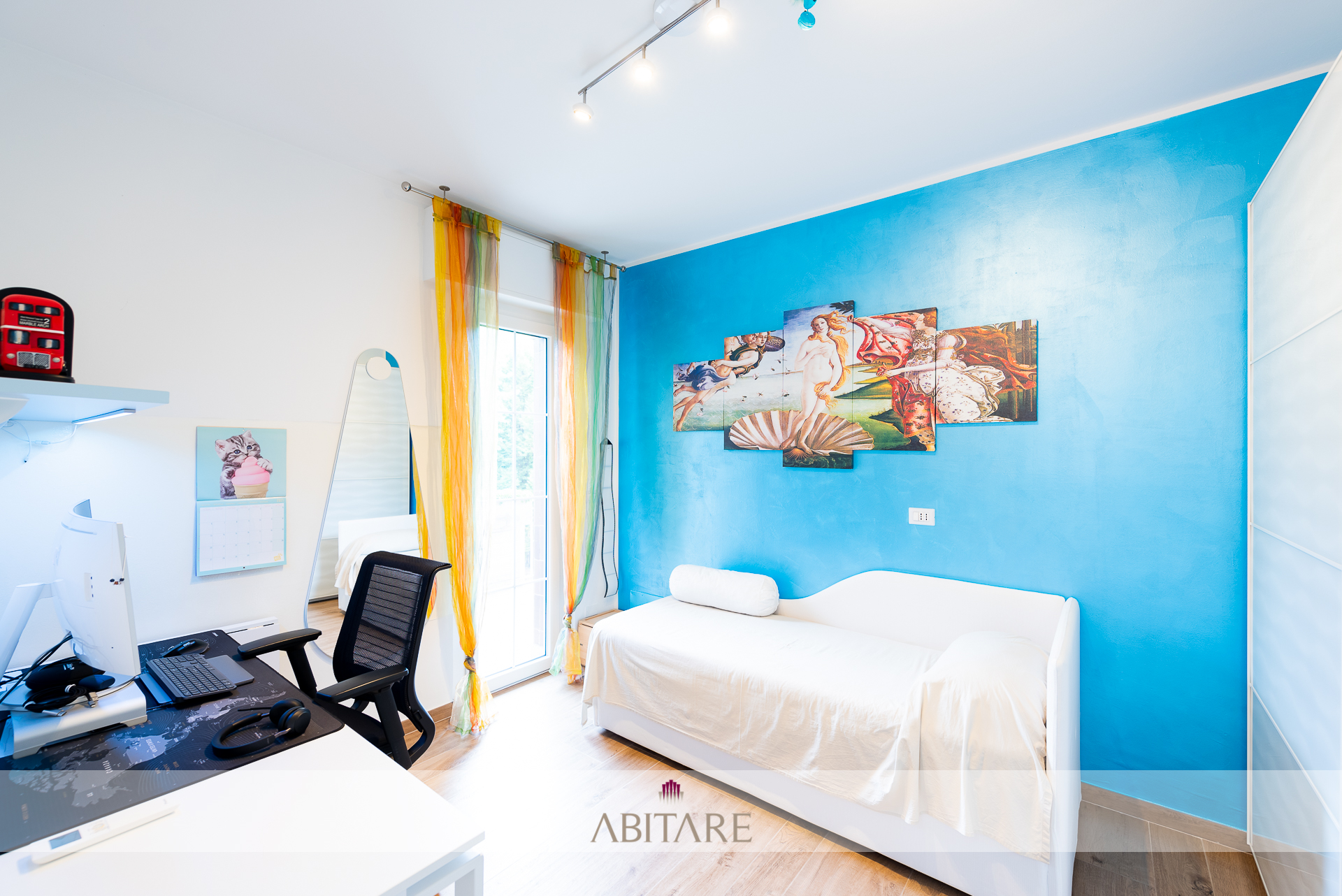 Ingresso, soggiorno di 37 mq. , cucina abitabile, camera da letto matrimoniale con accesso al balcone di servizio, ampio disimpegno, 2 camere singole, doppi servizi finestrati, ripostiglio e terrazzo di 32 mq.